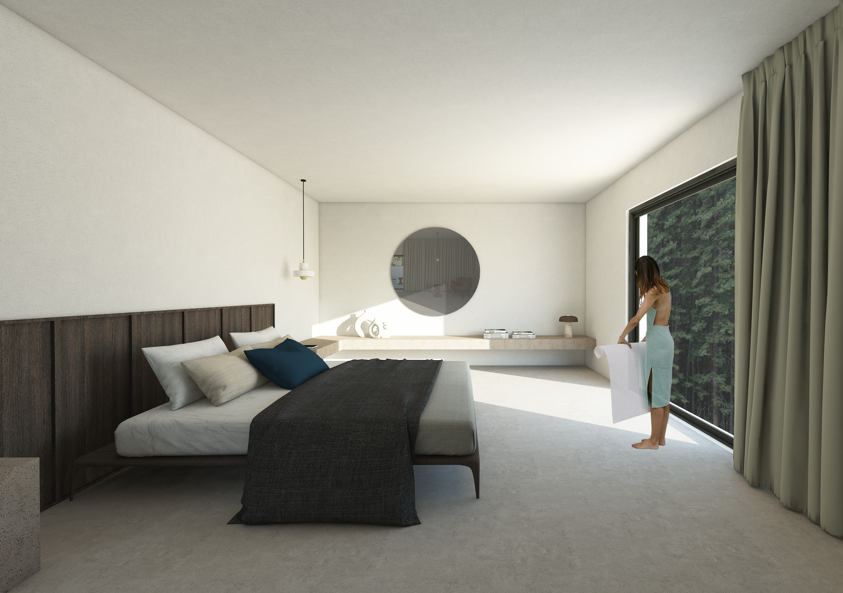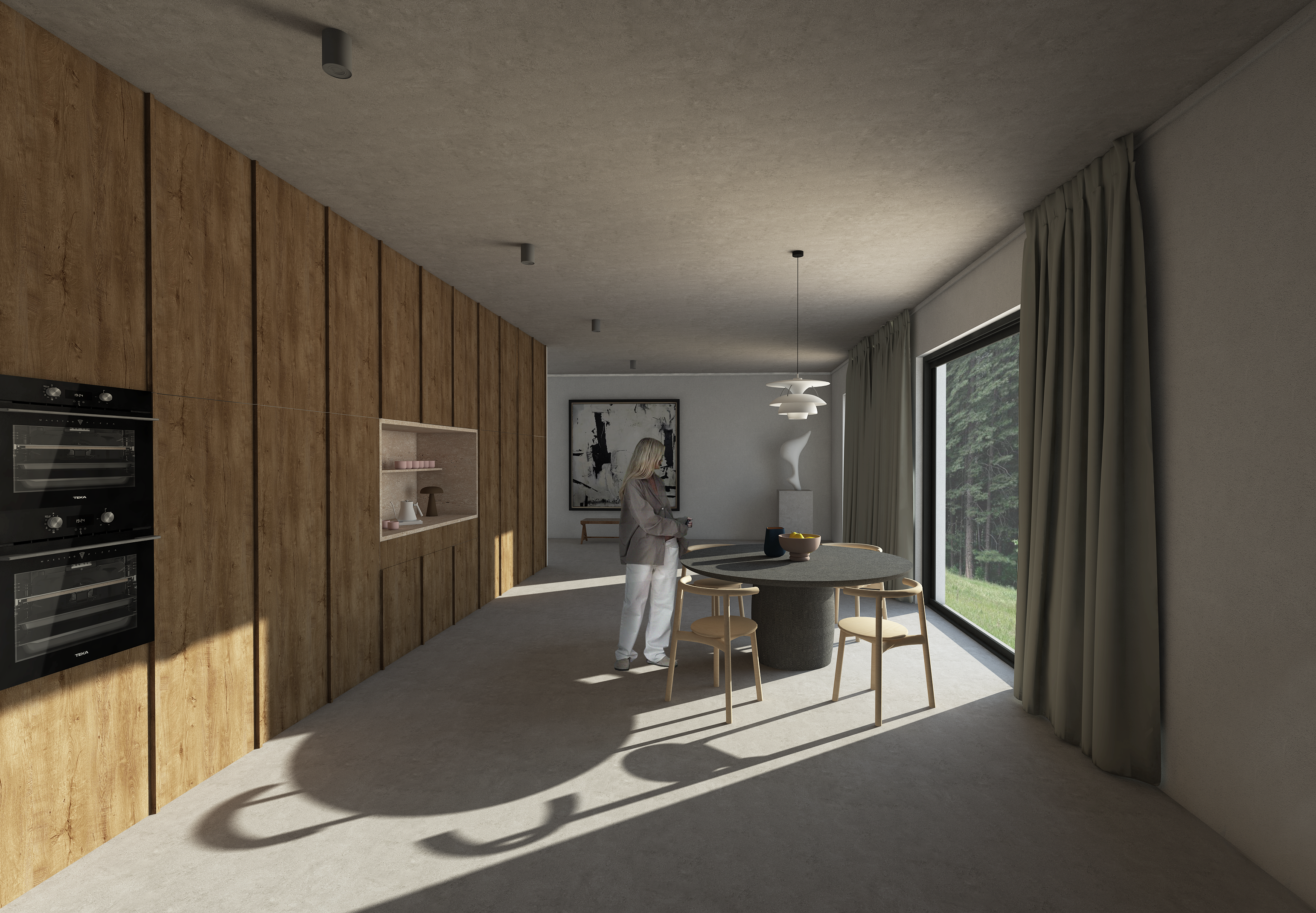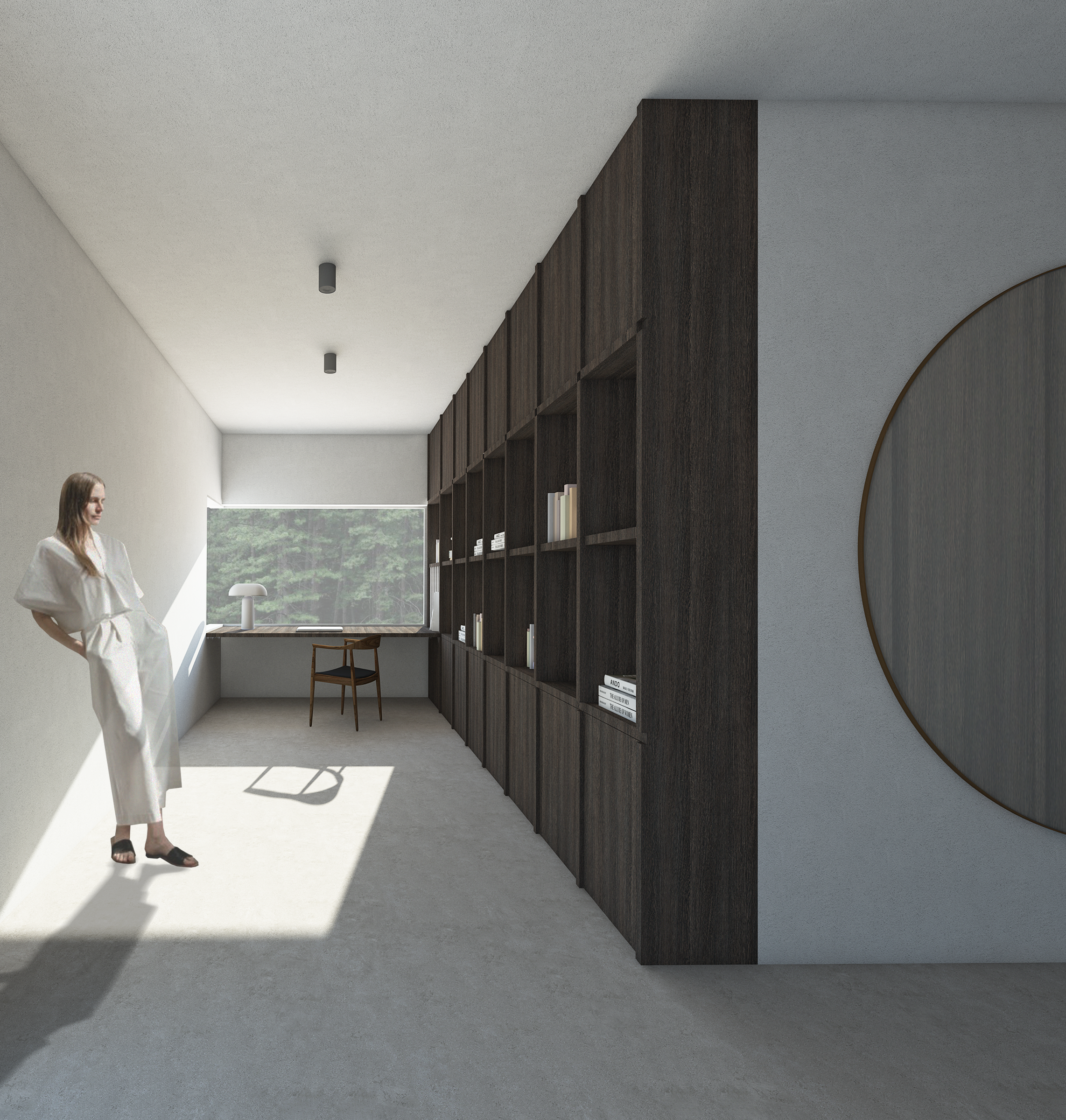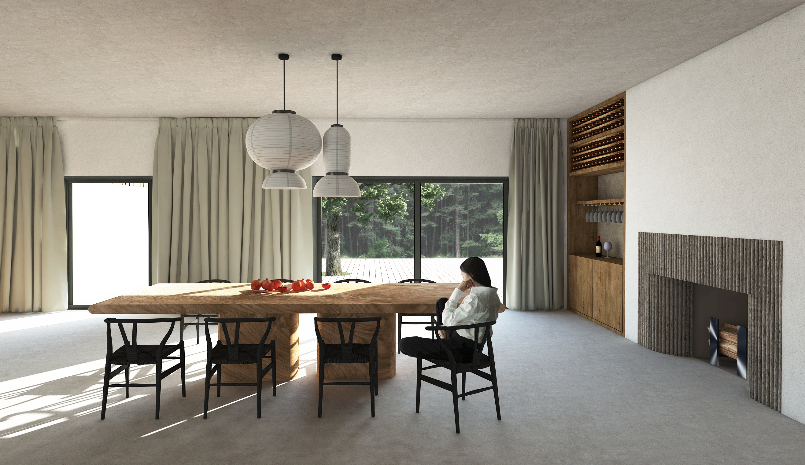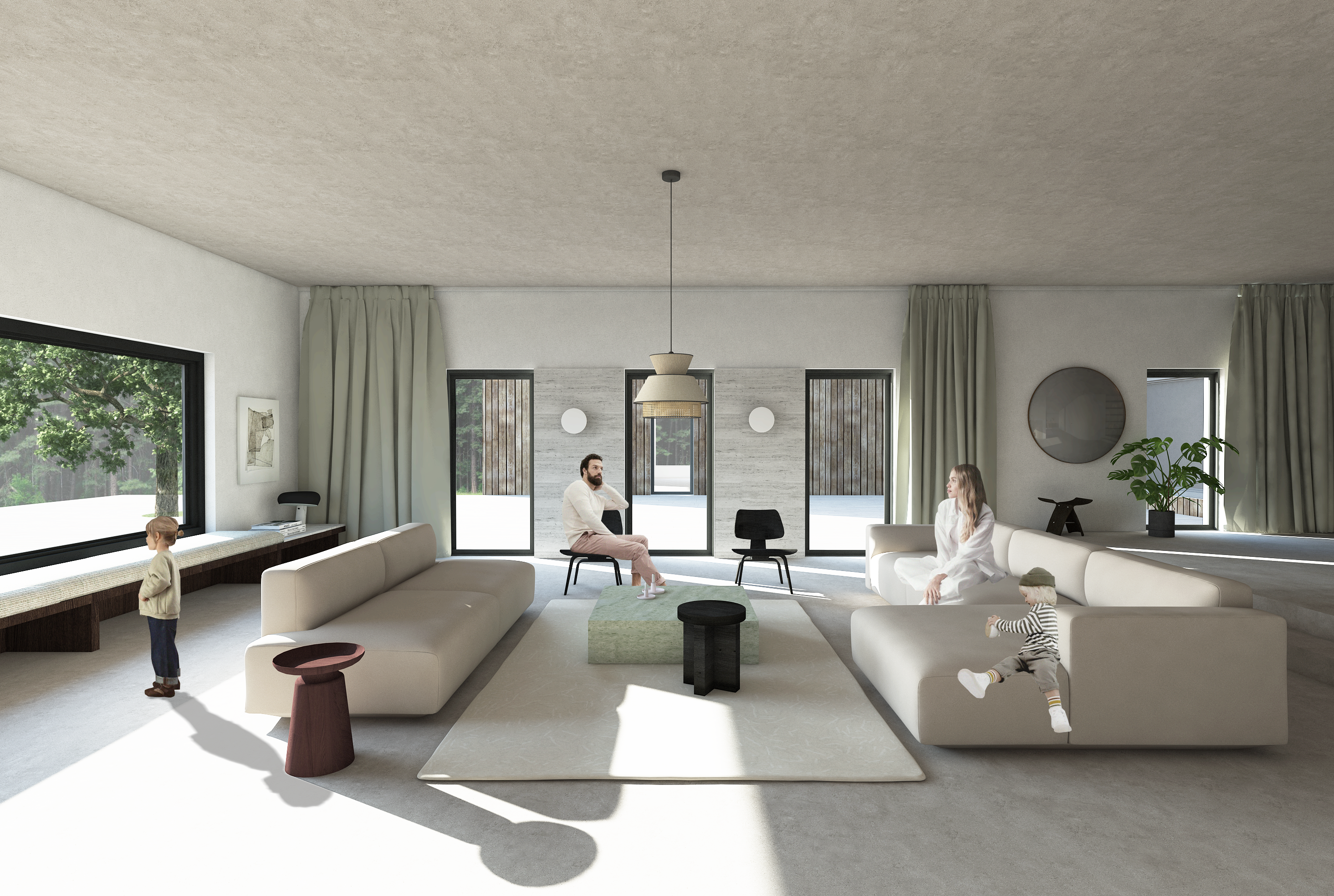 Dom został zaprojektowany dla czteroosobowej rodziny - pary z dwójką dzieci, zlokalizowany w sercu sosnowego lasu. Natura była tu największą inspiracją i jest integralną częścią wnętrz. Główne elementy przestrzeni to naturalne materiały takie jak dąb czy trawertyn. Proces projektowy stał się studium materiałowym - zrozumienie jak adaptują się one lub reagują na siebie nawzajem i co najważniejsze - jak człowiek dzięki zmysłowi dotyku i percepcji kształtuje relacje z nimi. Wnętrza wypełnione naturalnym światłem, ziemistymi i stonowanymi kolorami, czynią ten dom spokojną oazą wypełnioną ponadczasowymi wartościami i prostotą. Otwarte przestrzenie na parterze dają mieszkańcom poczucie wolności i tworzą stymulującą przestrzeń do życia. Architektura domu zaciera granicę między wnętrzem a zewnętrzem, tworząc schronienie dla ludzi, którzy chcą uciec od zgiełku i stresu współczesnego świata. Z wielką dbałością o detale i obiekty, przestrzeń domu tworzy ramy dla dobrostanu, intymności i spokoju.