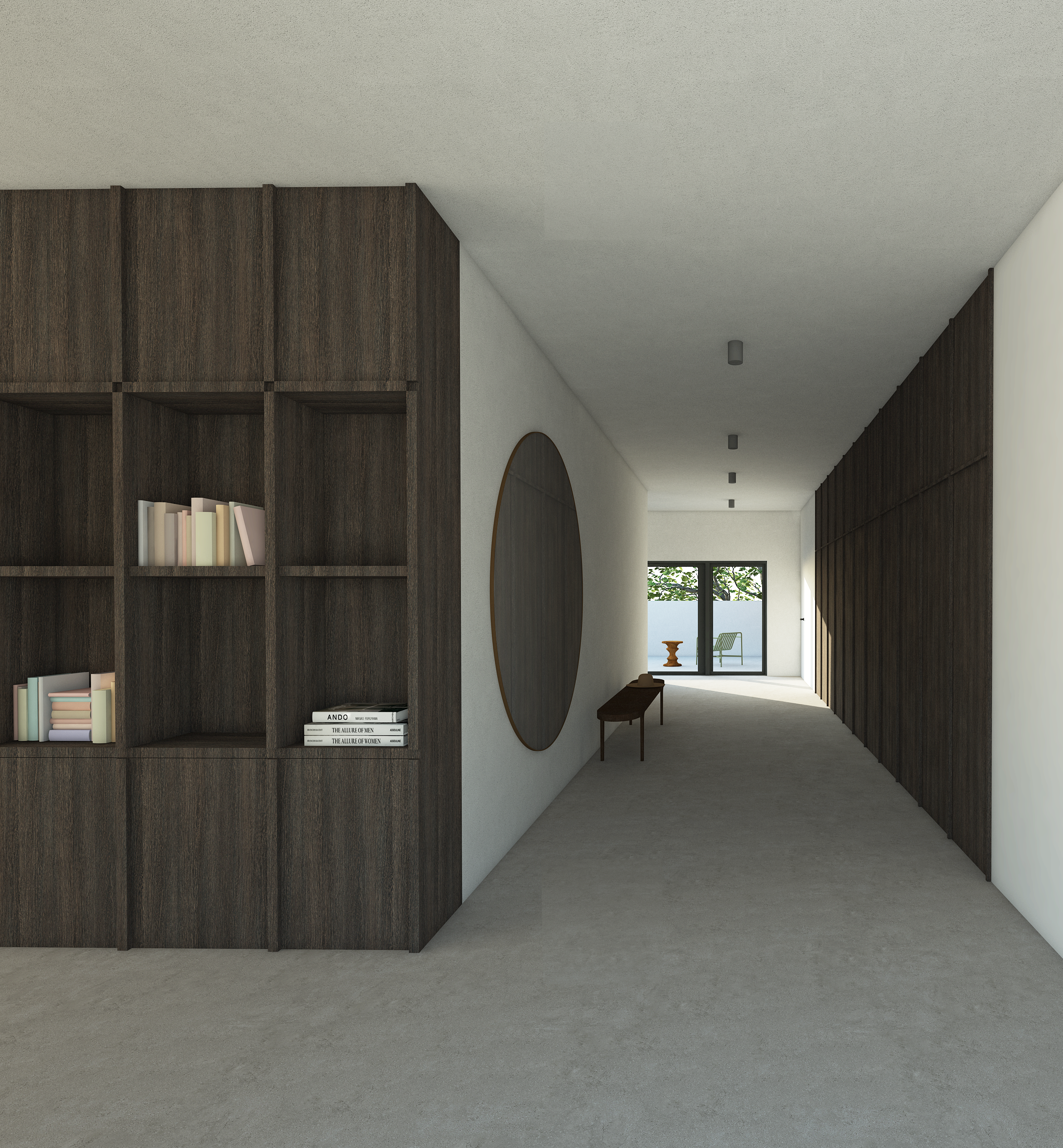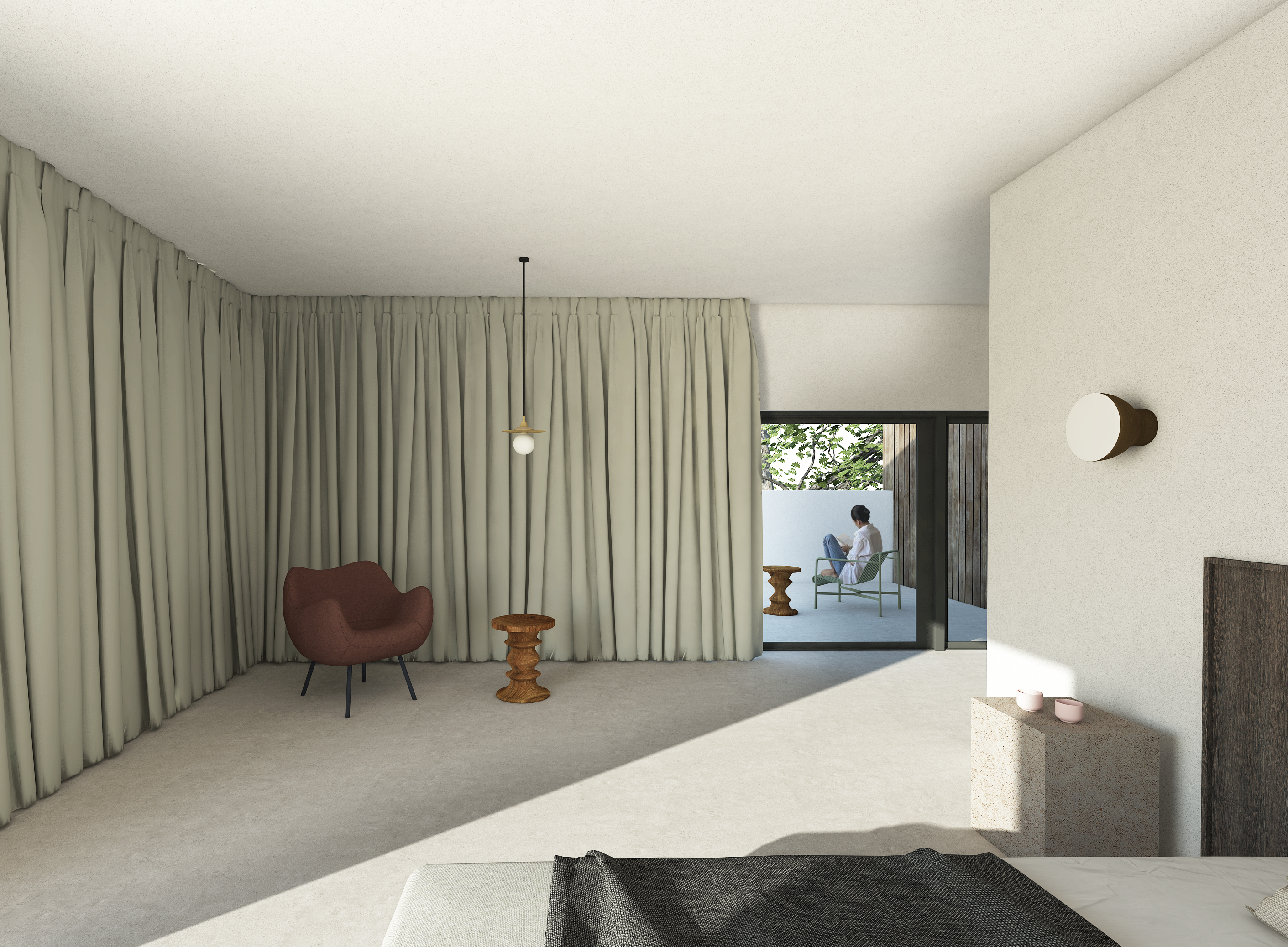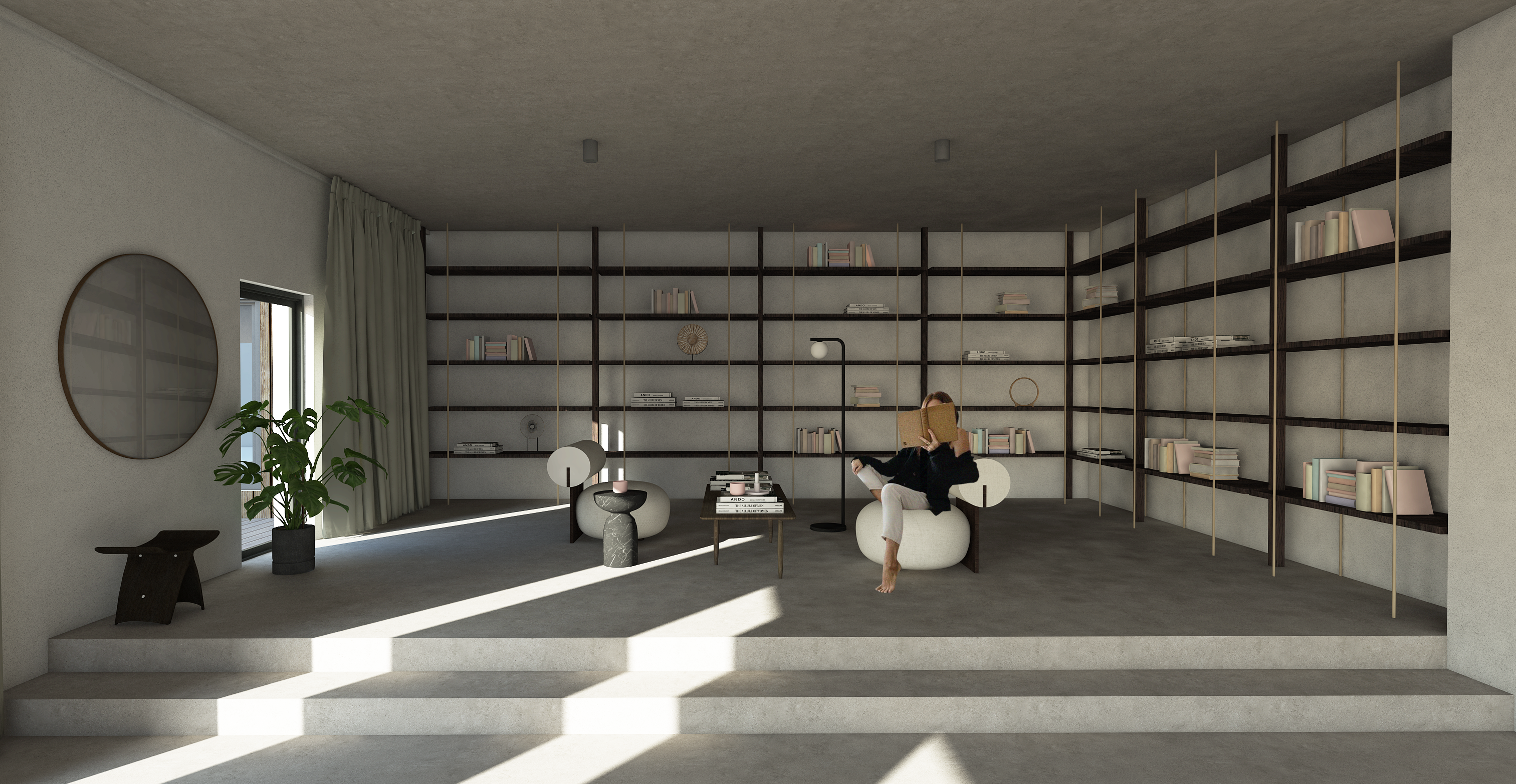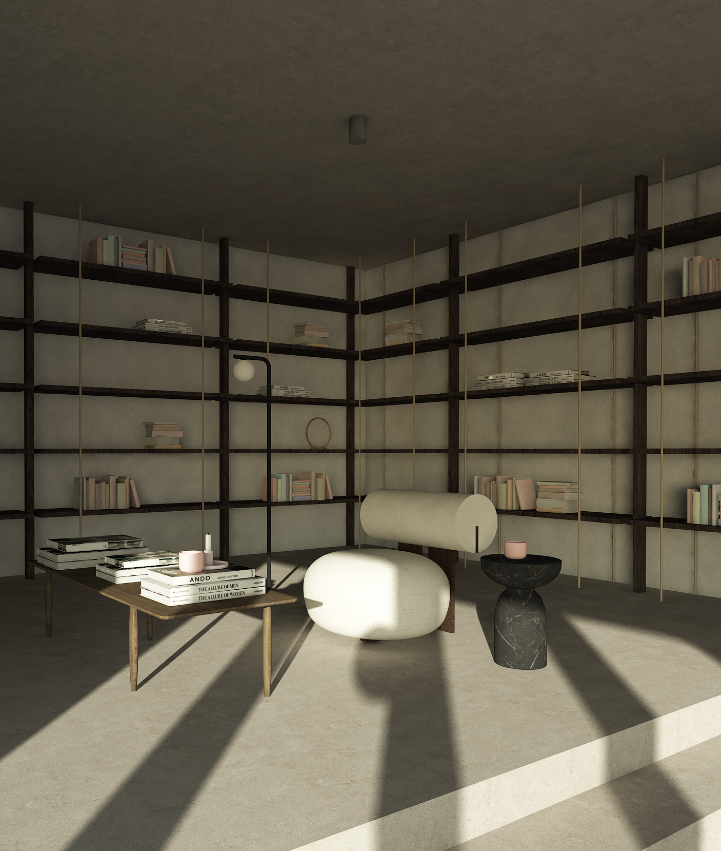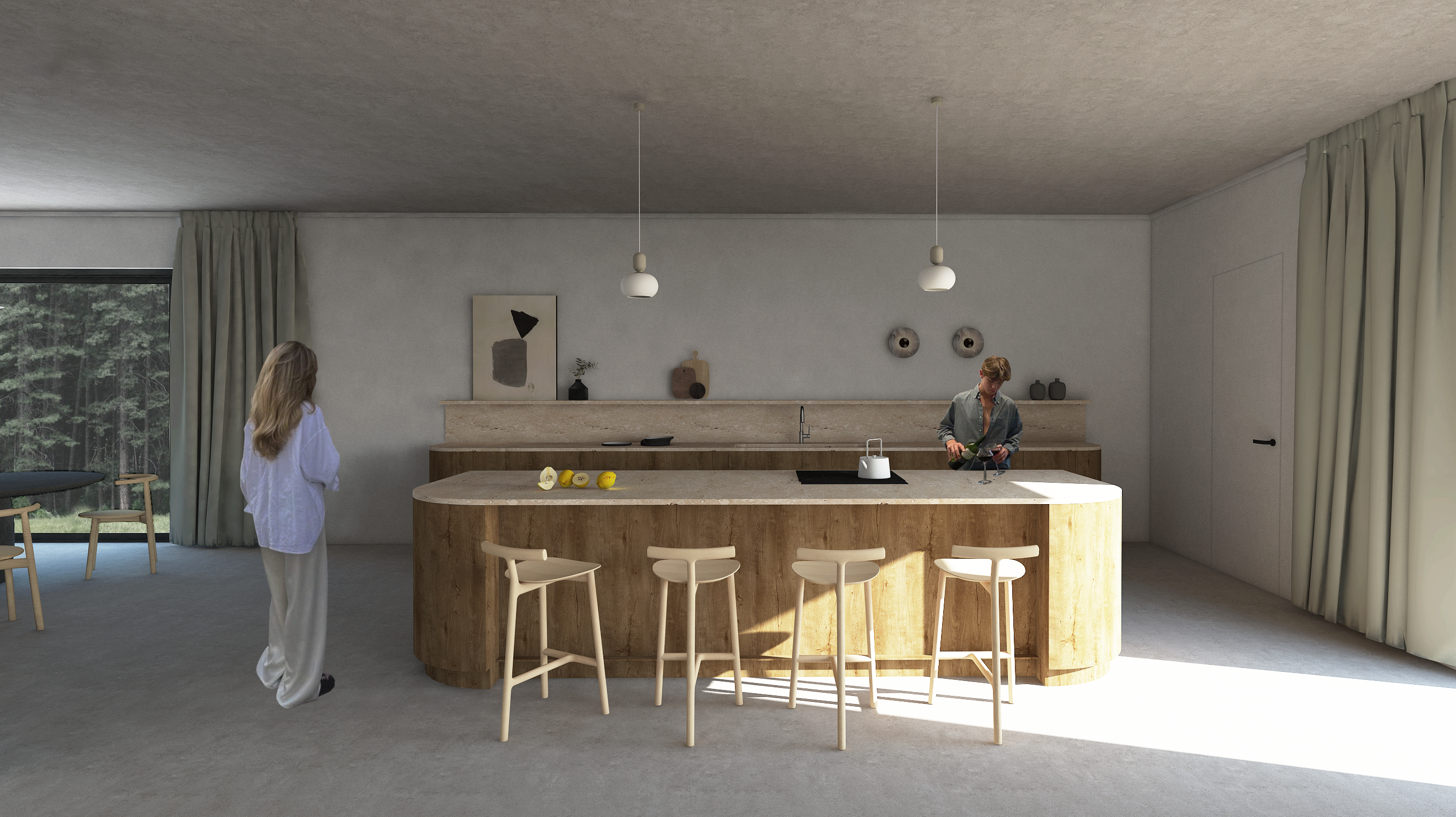 Dom został zaprojektowany dla czteroosobowej rodziny - pary z dwójką dzieci, zlokalizowany w sercu sosnowego lasu. Natura była tu największą inspiracją i jest integralną częścią wnętrz. Główne elementy przestrzeni to naturalne materiały takie jak dąb czy trawertyn. Proces projektowy stał się studium materiałowym - zrozumienie jak adaptują się one lub reagują na siebie nawzajem i co najważniejsze - jak człowiek dzięki zmysłowi dotyku i percepcji kształtuje relacje z nimi. Wnętrza wypełnione naturalnym światłem, ziemistymi i stonowanymi kolorami, czynią ten dom spokojną oazą wypełnioną ponadczasowymi wartościami i prostotą. Otwarte przestrzenie na parterze dają mieszkańcom poczucie wolności i tworzą stymulującą przestrzeń do życia. Architektura domu zaciera granicę między wnętrzem a zewnętrzem, tworząc schronienie dla ludzi, którzy chcą uciec od zgiełku i stresu współczesnego świata. Z wielką dbałością o detale i obiekty, przestrzeń domu tworzy ramy dla dobrostanu, intymności i spokoju.