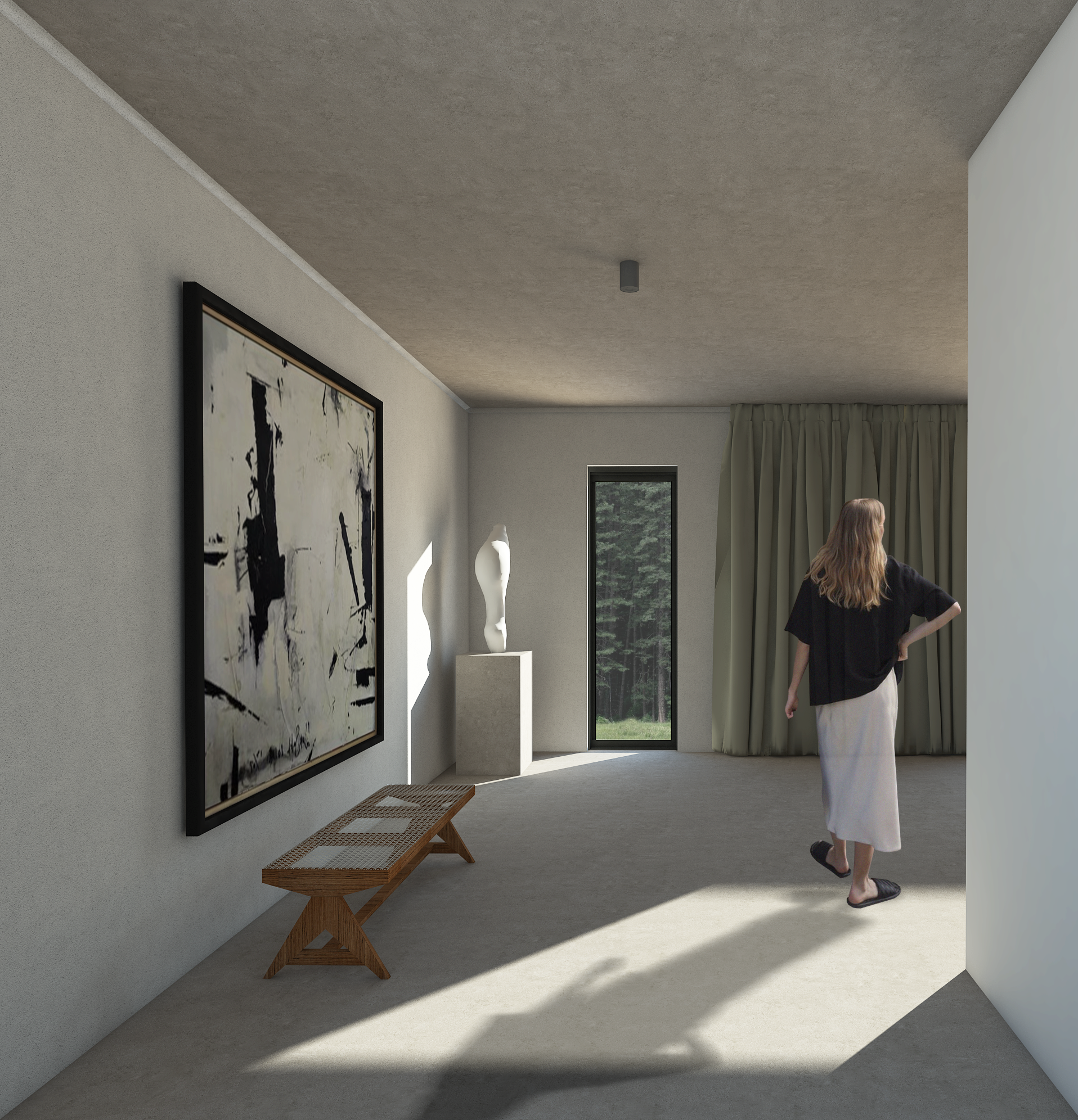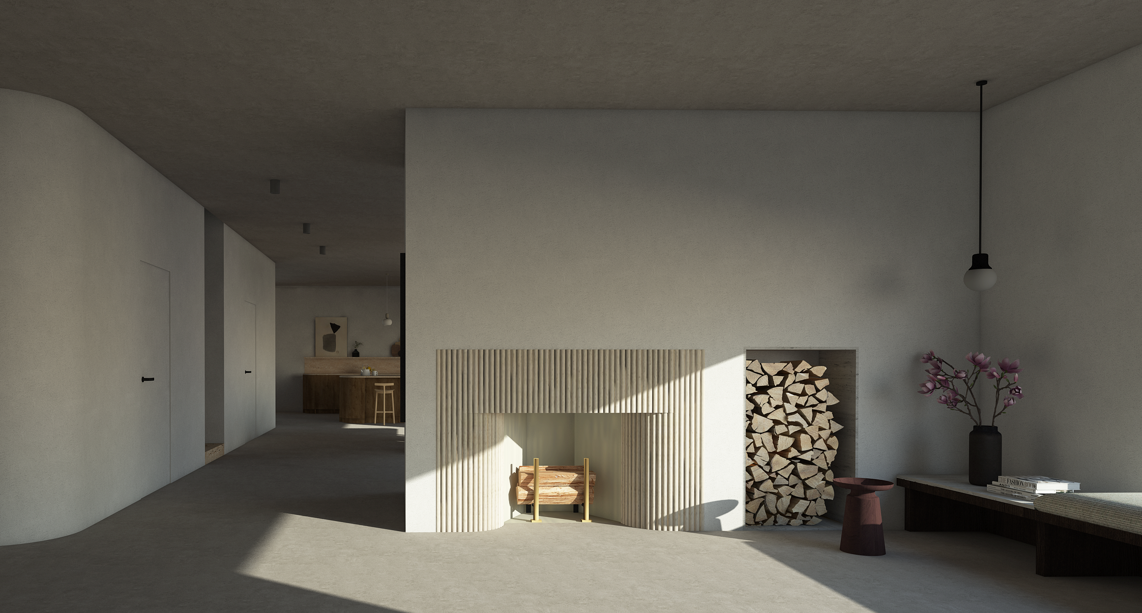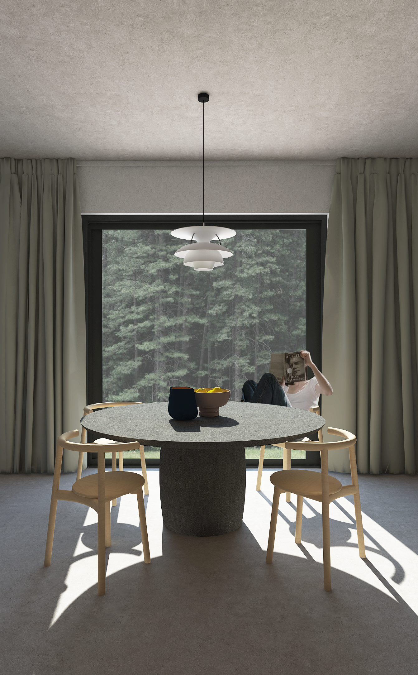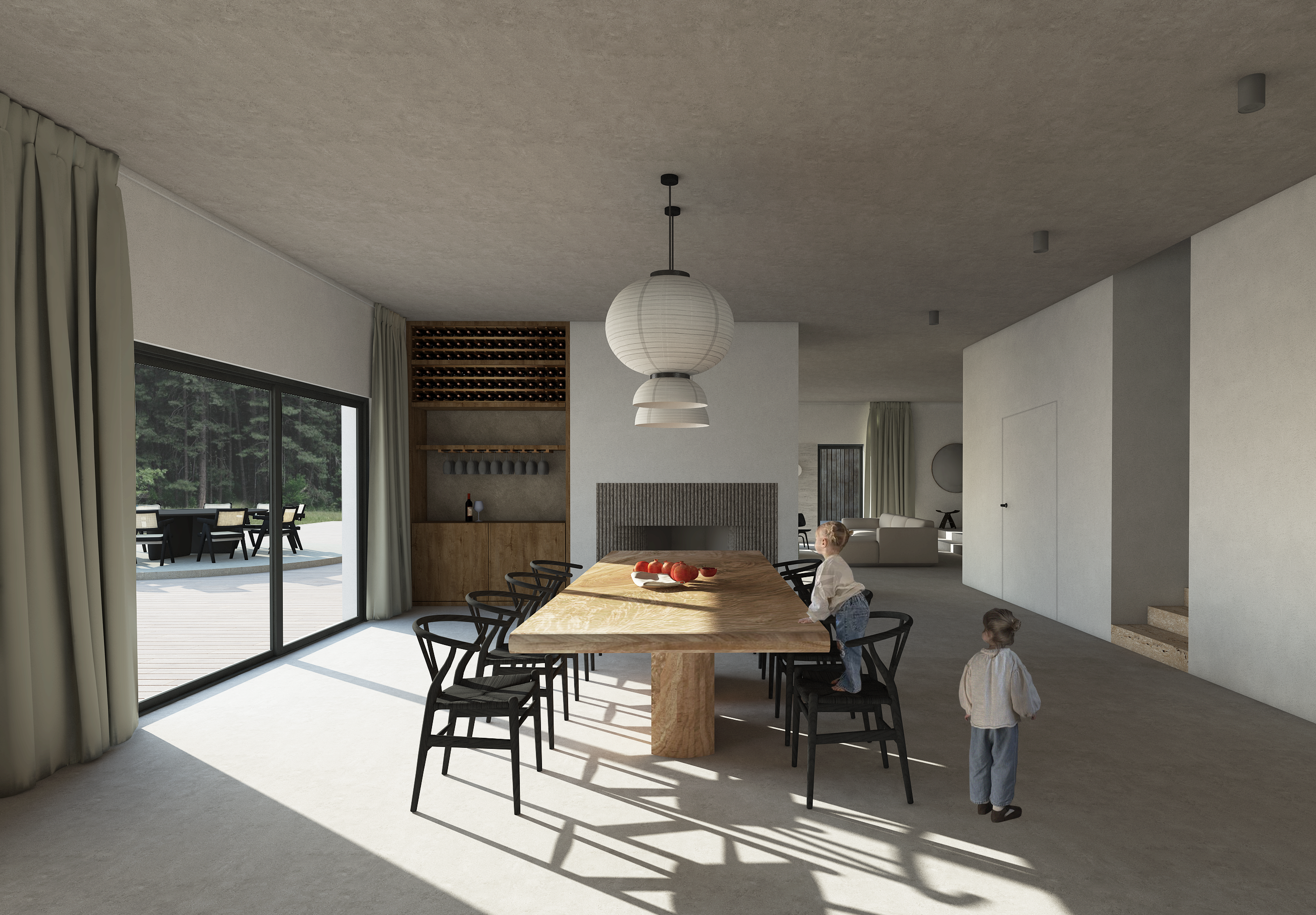 Dom został zaprojektowany dla czteroosobowej rodziny - pary z dwójką dzieci, zlokalizowany w sercu sosnowego lasu. Natura była tu największą inspiracją i jest integralną częścią wnętrz. Główne elementy przestrzeni to naturalne materiały takie jak dąb czy trawertyn. Proces projektowy stał się studium materiałowym - zrozumienie jak adaptują się one lub reagują na siebie nawzajem i co najważniejsze - jak człowiek dzięki zmysłowi dotyku i percepcji kształtuje relacje z nimi. Wnętrza wypełnione naturalnym światłem, ziemistymi i stonowanymi kolorami, czynią ten dom spokojną oazą wypełnioną ponadczasowymi wartościami i prostotą. Otwarte przestrzenie na parterze dają mieszkańcom poczucie wolności i tworzą stymulującą przestrzeń do życia. Architektura domu zaciera granicę między wnętrzem a zewnętrzem, tworząc schronienie dla ludzi, którzy chcą uciec od zgiełku i stresu współczesnego świata. Z wielką dbałością o detale i obiekty, przestrzeń domu tworzy ramy dla dobrostanu, intymności i spokoju.