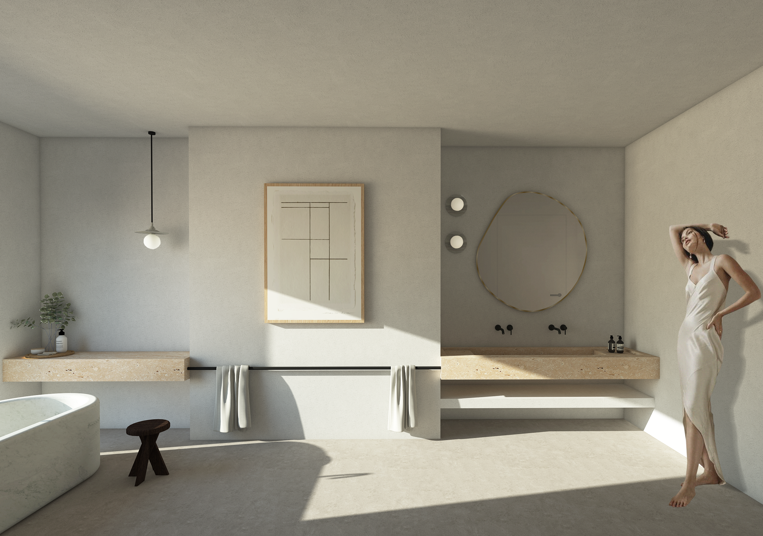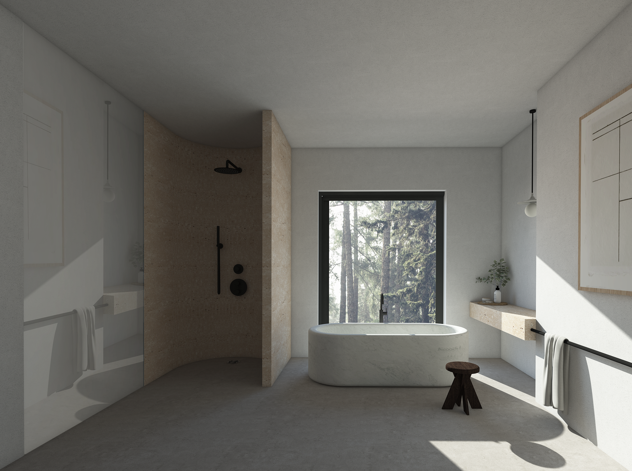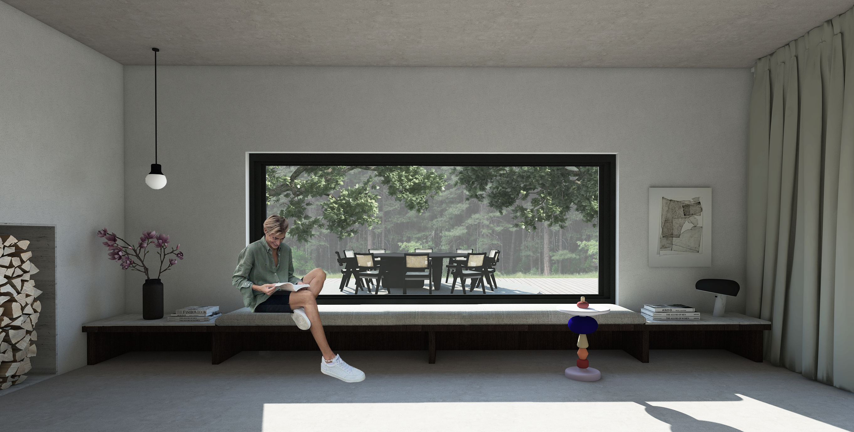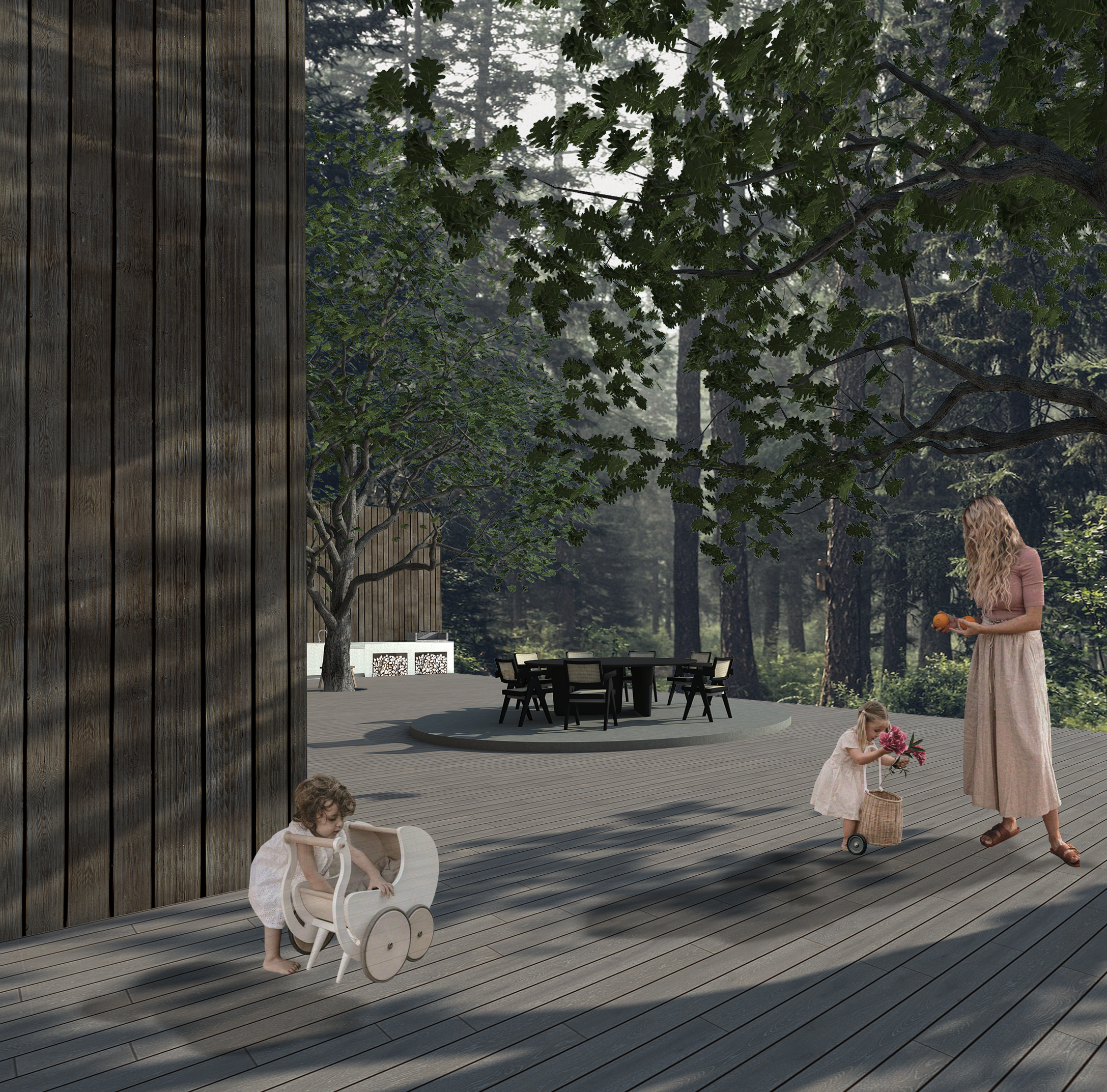Dom został zaprojektowany dla czteroosobowej rodziny - pary z dwójką dzieci, zlokalizowany w sercu sosnowego lasu. Natura była tu największą inspiracją i jest integralną częścią wnętrz. Główne elementy przestrzeni to naturalne materiały takie jak dąb czy trawertyn. Proces projektowy stał się studium materiałowym - zrozumienie jak adaptują się one lub reagują na siebie nawzajem i co najważniejsze - jak człowiek dzięki zmysłowi dotyku i percepcji kształtuje relacje z nimi. Wnętrza wypełnione naturalnym światłem, ziemistymi i stonowanymi kolorami, czynią ten dom spokojną oazą wypełnioną ponadczasowymi wartościami i prostotą. Otwarte przestrzenie na parterze dają mieszkańcom poczucie wolności i tworzą stymulującą przestrzeń do życia. Architektura domu zaciera granicę między wnętrzem a zewnętrzem, tworząc schronienie dla ludzi, którzy chcą uciec od zgiełku i stresu współczesnego świata. Z wielką dbałością o detale i obiekty, przestrzeń domu tworzy ramy dla dobrostanu, intymności i spokoju.